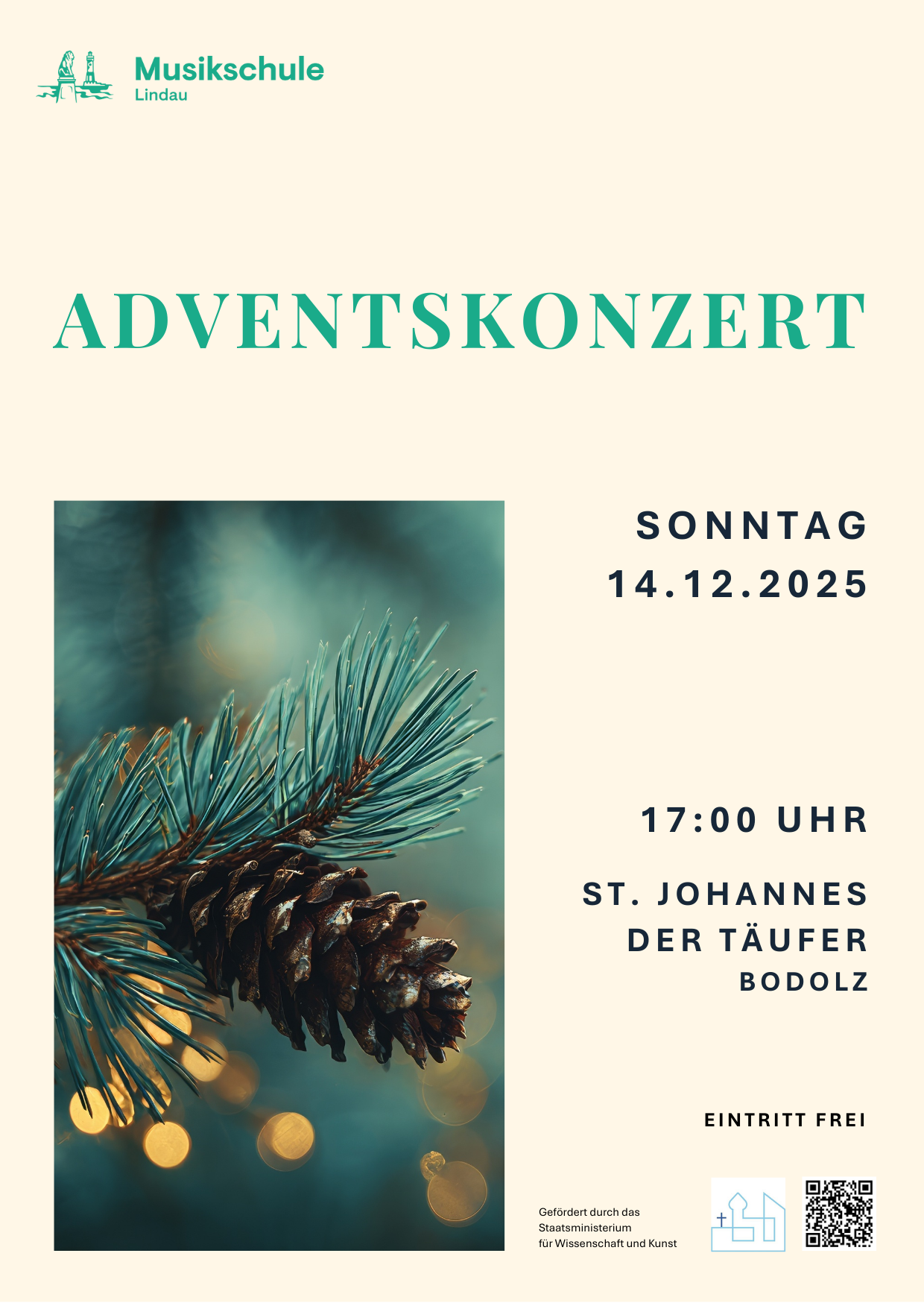 « Alle VeranstaltungenDiese Veranstaltung hat bereits stattgefunden.AdventskonzertSonntag, 14. Dezember 2025, 17:00 - 18:00« Herbstzauber – Herbstfest der Jugendkapelle LindauKammermusikalisches zur Weihnachtszeit. »Es musiziert der Kinderchor und die verschiedenen Orchester der Musikschule Lindau. Zum Kalender hinzufügen Google Kalender iCalendar Outlook 365 Outlook Live Details Datum: Sonntag, 14. Dezember 2025 Zeit: 17:00 - 18:00 Veranstalter Musikschule Lindau e.V. Telefon 08382/944 597 Veranstaltungsort St. Johannes der Täufer Kirchstraße 51 Bodolz, 88131 Germany