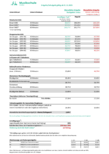 Schulgeld-TabelleSchulgeld-/Entgelt ÜbersichtHier ist die aktuell gültibe Übersicht über unsere Unterrichtsentgelte (Schulgeld).Mit einem Klick auf das Foto können Sie sich die Tabelle im PDF-Format herunterladen.