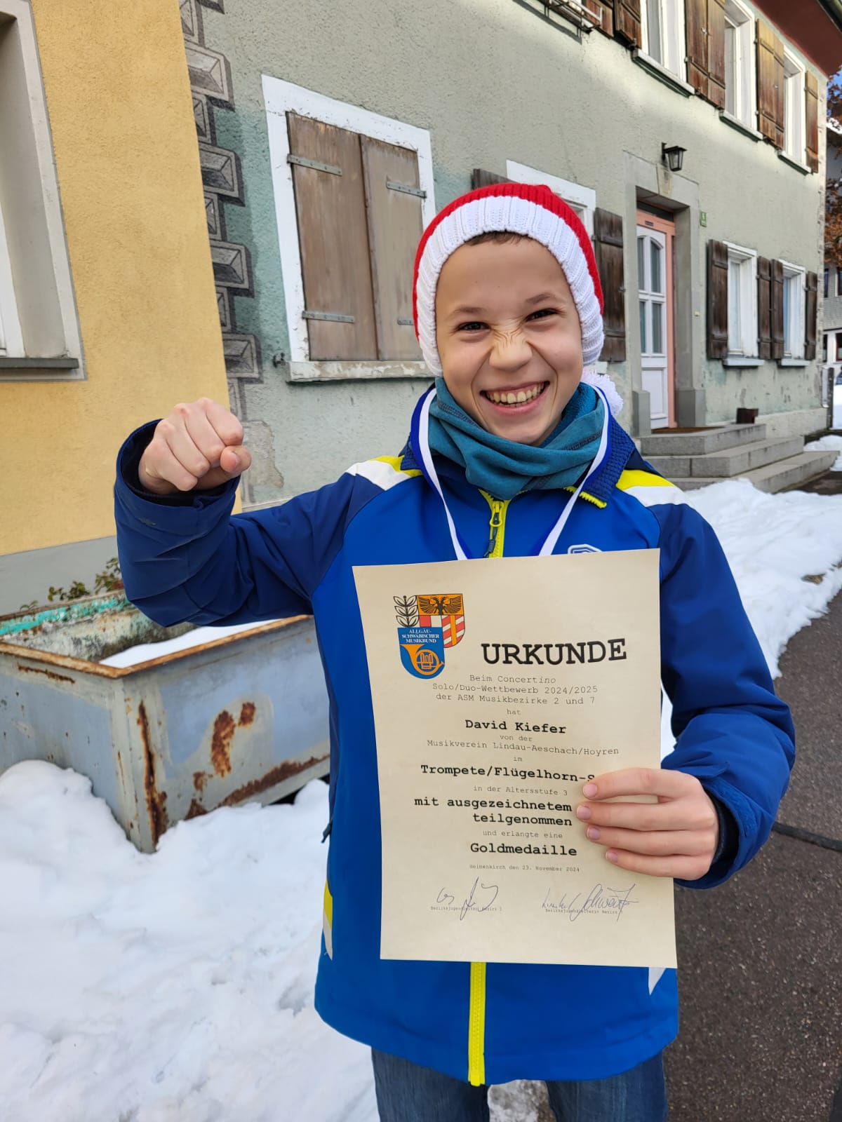 Unser Schüler David Kiefer, 14 Jahre alt, aus der Klasse von Hermann Ulmschneider, hat am Samstag, den 23. November 2024, beim Concertino Wettbewerb in der Kategorie Solo-Duo Trompete die Goldmedaille mit der Höchstpunktzahl von 100 Punkten erreicht. Ein herausragendes Ergebnis! Wir sind unglaublich stolz auf David und gratulieren ihm sowie seinem Lehrer Hermann Ulmschneider ganz herzlich zu diesem tollen Erfolg.