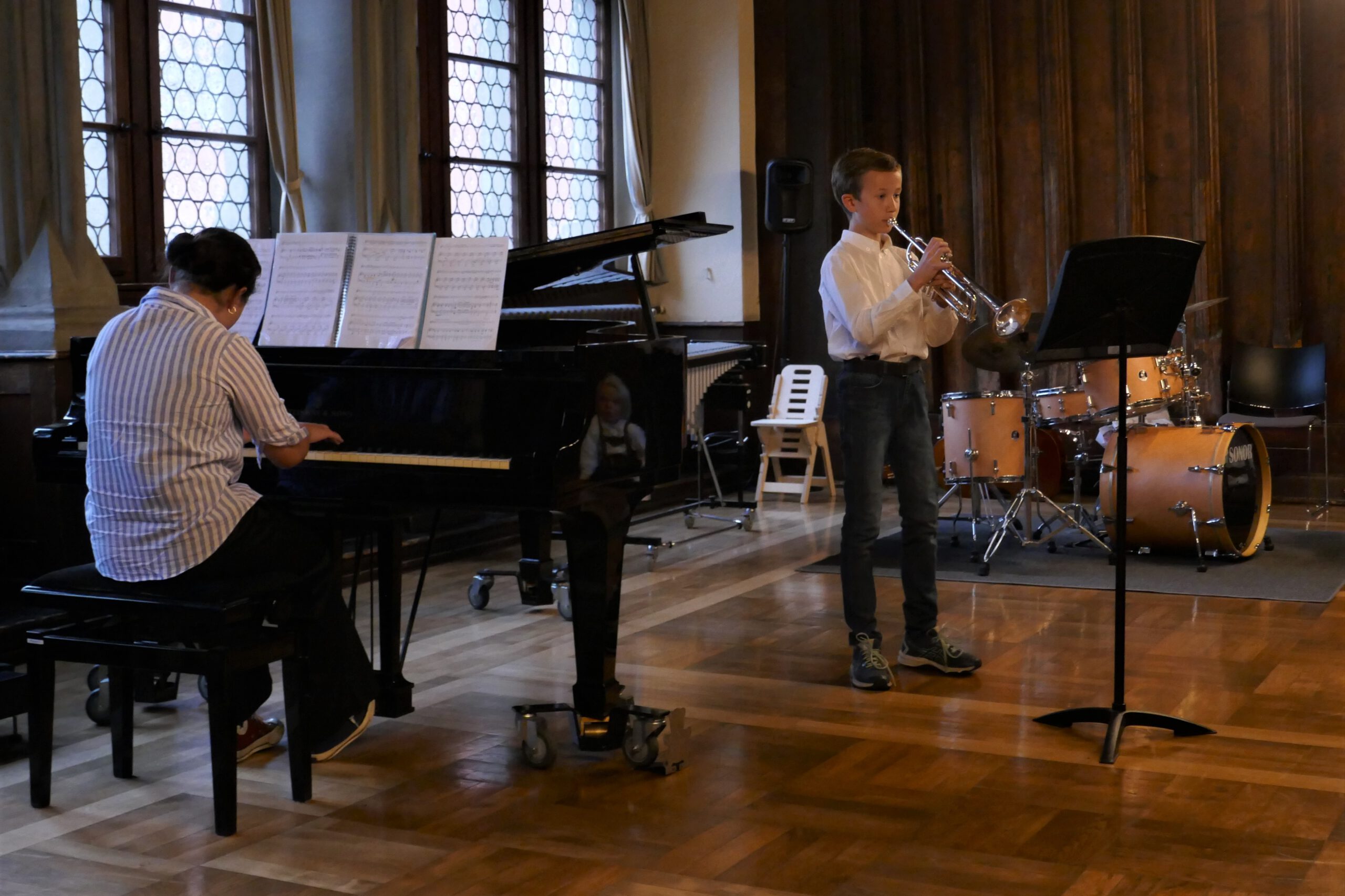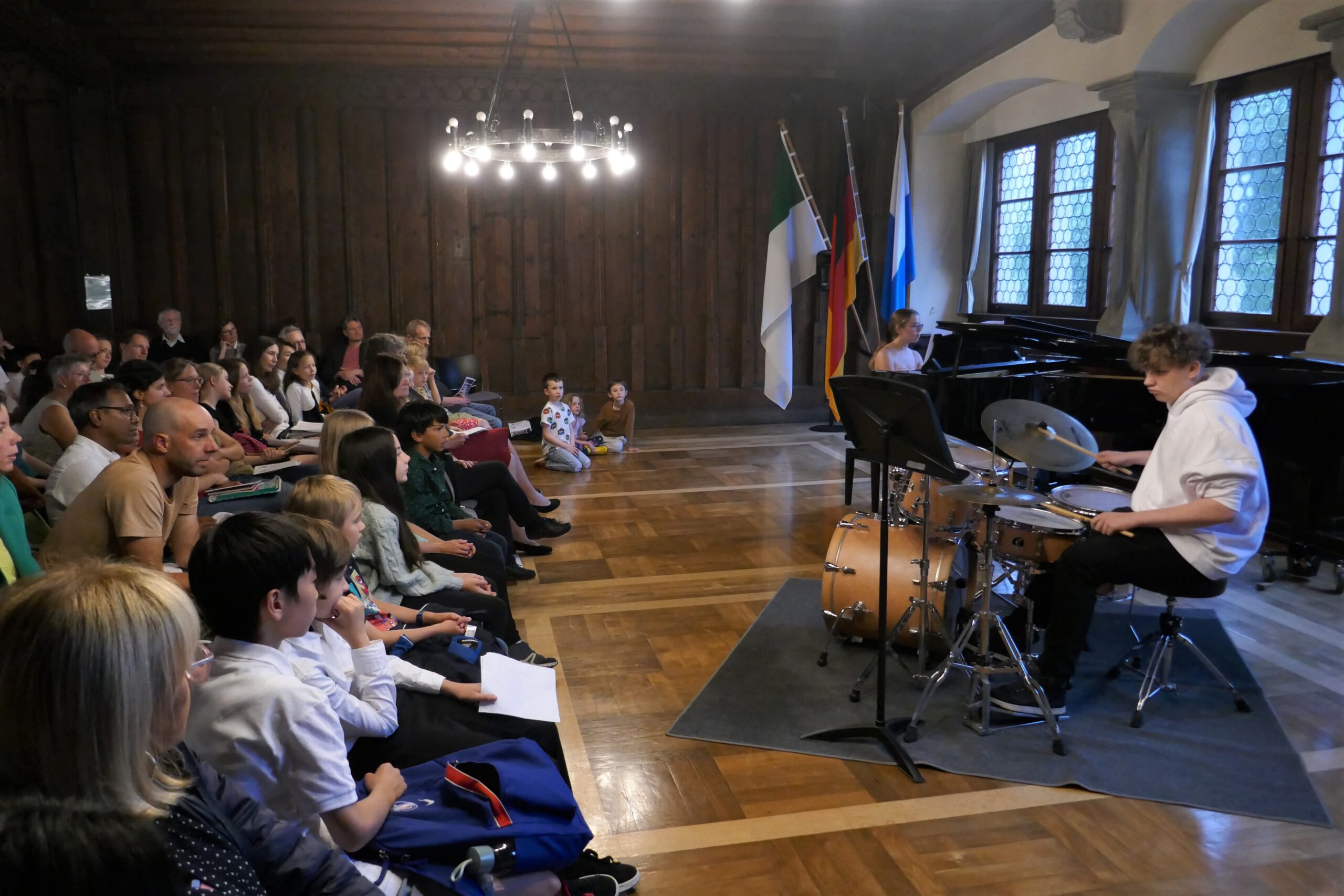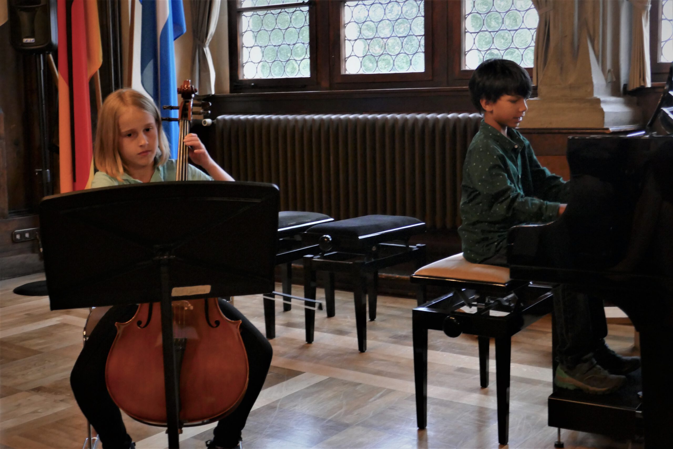 gelohnt hat, bewiesen die kleinen und großen „Musizierfreunde“: Ob verträumte Klänge beim Vierhändig-Spiel am Klavier, schwungvoller Karibik-Sound mit Posaune, ausdrucksvolle Cello – Klänge, kraftvoll präsentierte Klavier-Musik zu 6 Händen, zarte Geigenmelodien oder ein rhythmisch vertrackter Dialog zwischen Klavier und Drumset – alle Musikschüler zeigten ein beeindruckendes Können und einen souveränen Auftritt. Das Publikum war begeistert von dem fein abgestimmten Musizieren, der spürbaren Spielfreude und dem abwechslungsreichen Programm. Langanhaltender Beifall belohnte die jungen Künstler.